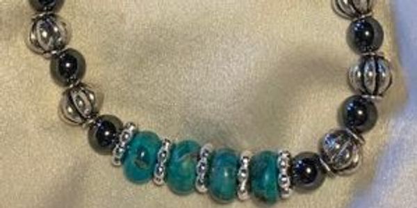 Turquoise and Hemetite semi precious stones silver bead accents. 7 1/2 inch stretch bracelet